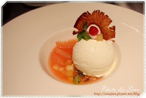 老公挑了鮮果葡萄柚雪酪,這道是冰淇淋甜品,之前點過烤濃漿巧克力冰淇淋,我們覺得太甜了,換了雪酪,酸酸甜甜的味道更好,老公自己吃得很高興。