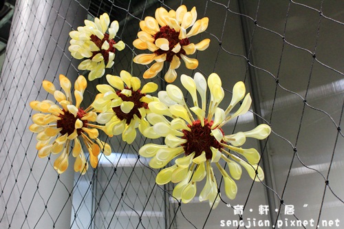 遠看我以為是種在牆上的花,近看才發現,原來是湯匙做出來的假花啊!很有藝術感,軒的平日美勞又多了一樣可以做了,哈!