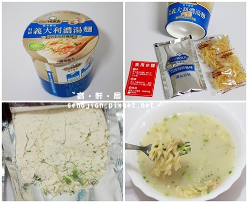 沖泡方式方便又簡單,先將義大利麵倒入杯中,注入煮沸的熱水約270CC,再將調味包倒入,攪拌均勻後在蓋上杯蓋,靜置3分鐘即可享用囉!