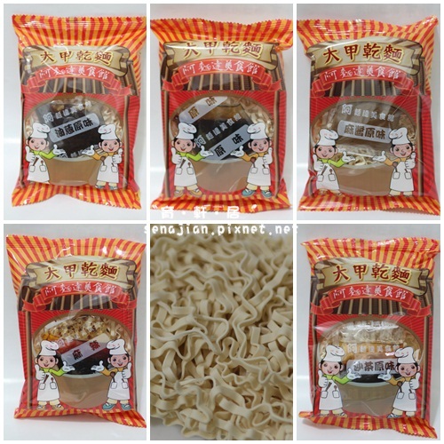 大甲乾麵推出的口味很多,我試吃五種口味,有原味(素食可)、麻辣(葷)、沙茶原味(葷)、油蔥原味(葷)、麻醬原味(素食可),麵條為扁細麵。