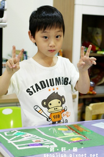 平常軒在家畫畫,我都盡量要求他有始有終,既然畫了就要完成,所以軒就努力地把這幅創意畫作都塗上顏色,最後開開心心的讓我拍照。