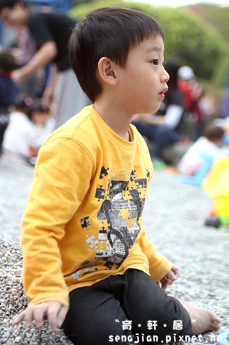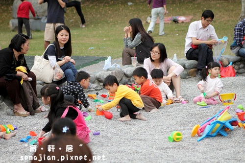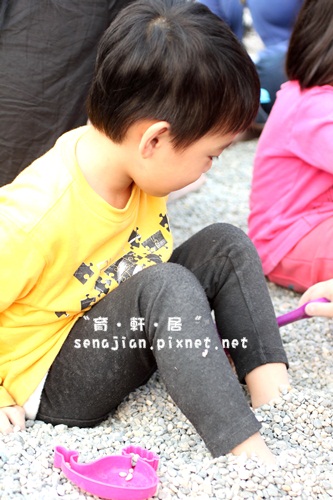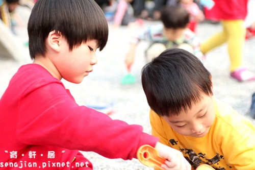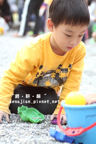 軒絕對不會讓自己孤單,所以自己會去找別人家的小朋友一起玩,他沒帶多少玩砂工具出來,自己倒是創造了更多交換玩具的機會。