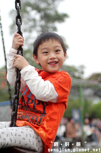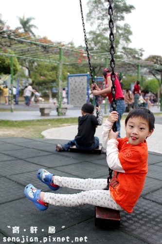 砂坑玩了好久,天色漸暗,把軒叫過來洗洗手腳,換個乾淨的衣服,讓他玩玩公園裡的設施。
