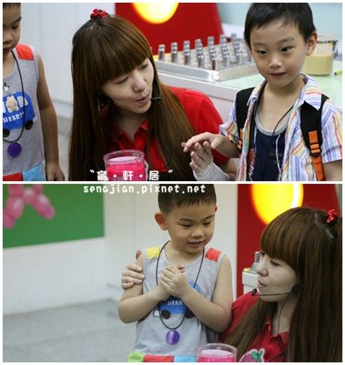 草莓姊姊請兩個小朋友上臺來,聞聞看乳膠的味道,剛開始還說乳膠是香的,後來仔細聞一聞,才說是臭的....
