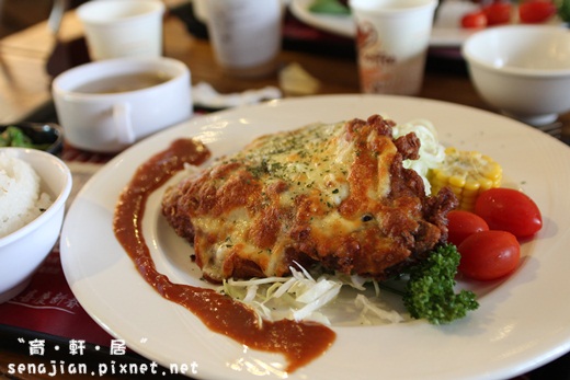 老妹點的是蘇黎士焗烤丁骨豬排,丁骨部位的豬肉上鋪著烤得脆又多汁的起司,吃起來口感極佳且很好下飯。