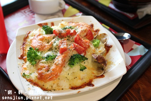 這是吉娜點的西西里海鮮焗烤飯,整個份量超大,母子倆一起吃剛剛好,裡頭少不了鮮蝦、蛤仔,光是吃焗烤上頭的料就夠飽餐一頓了。