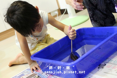 再來就是要玩另一種染畫囉!幫幫動桌上的顏料,糾察隊長軒就出聲喝止。